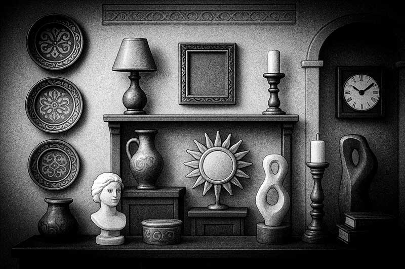 Objets-d’art & curiosités : petits bustes stylisés, boîtes de rangement ornées, plateaux gravés et objets utilitaires (bougeoirs, porte-livres) mêlant marqueterie, métal et résines nobles.